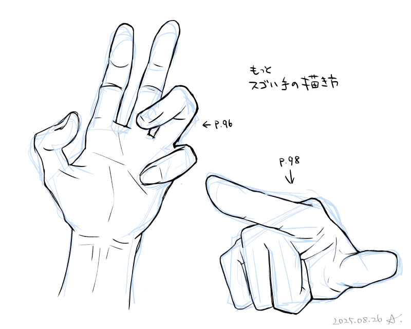 2025/08/26 昨日今日とやる気が出ない 30秒ドローイングってやつをやってみるか!と思ったものの全然描けず、倍の60秒にしたけどそれでも描けず。 私にはまだ早いんだろうなということでやめにした というわけで手の模写をした 模写したのは2冊目のほう 1冊目 も持っています 重複ページもあるから調べてから買った方が良いかも 1冊目はポーズ例が豊富、2冊目は肩〜指先までの描き方も教えてくれている など 全然似てないんですが、正直私が描くようなマンガなら、手はこの程度描けてればいいんじゃないのかなぁという気はしています 体はホントに描けてなさすぎてマズいなと思っています #練習 #雑記