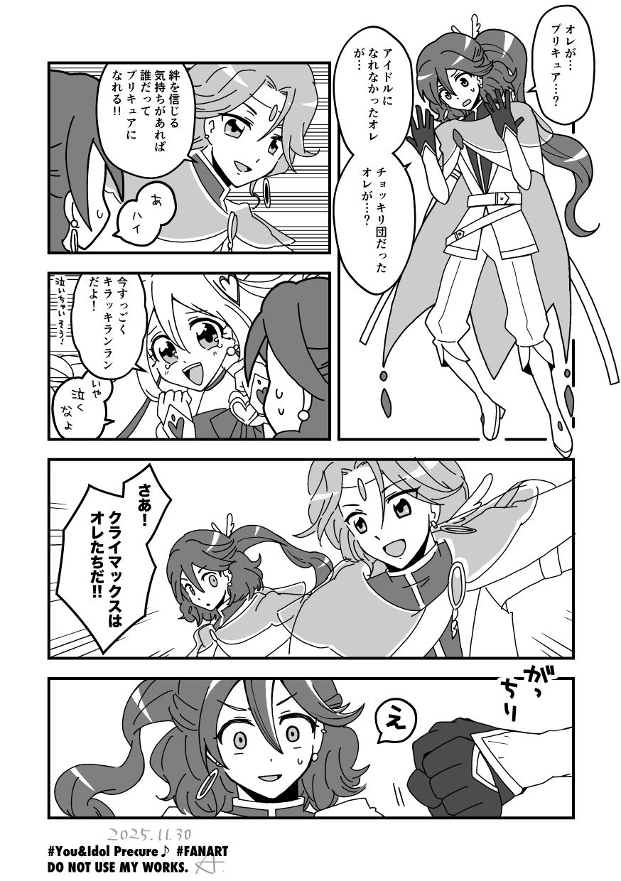 今朝のプリキュア見てビックリして描きました。急に変身するじゃん…… 今朝のプリキュア見てビックリして描きました。急に変身するじゃん…… 「なに歌ってんだよ!状況分かってんのか!?」というカズマのツッコミがすごく面白かったし、あ〜苦労人系常識人枠だ〜!と思いました。 ※「クライマックスは私(私たち)!」と言ってから、歌って踊ってファンサして必殺技を放つ流れなんです 成人男性には全く見えなくて本当にすみません。 これでもいつもよりは足が長いし、首も太いです。 #キミプリ